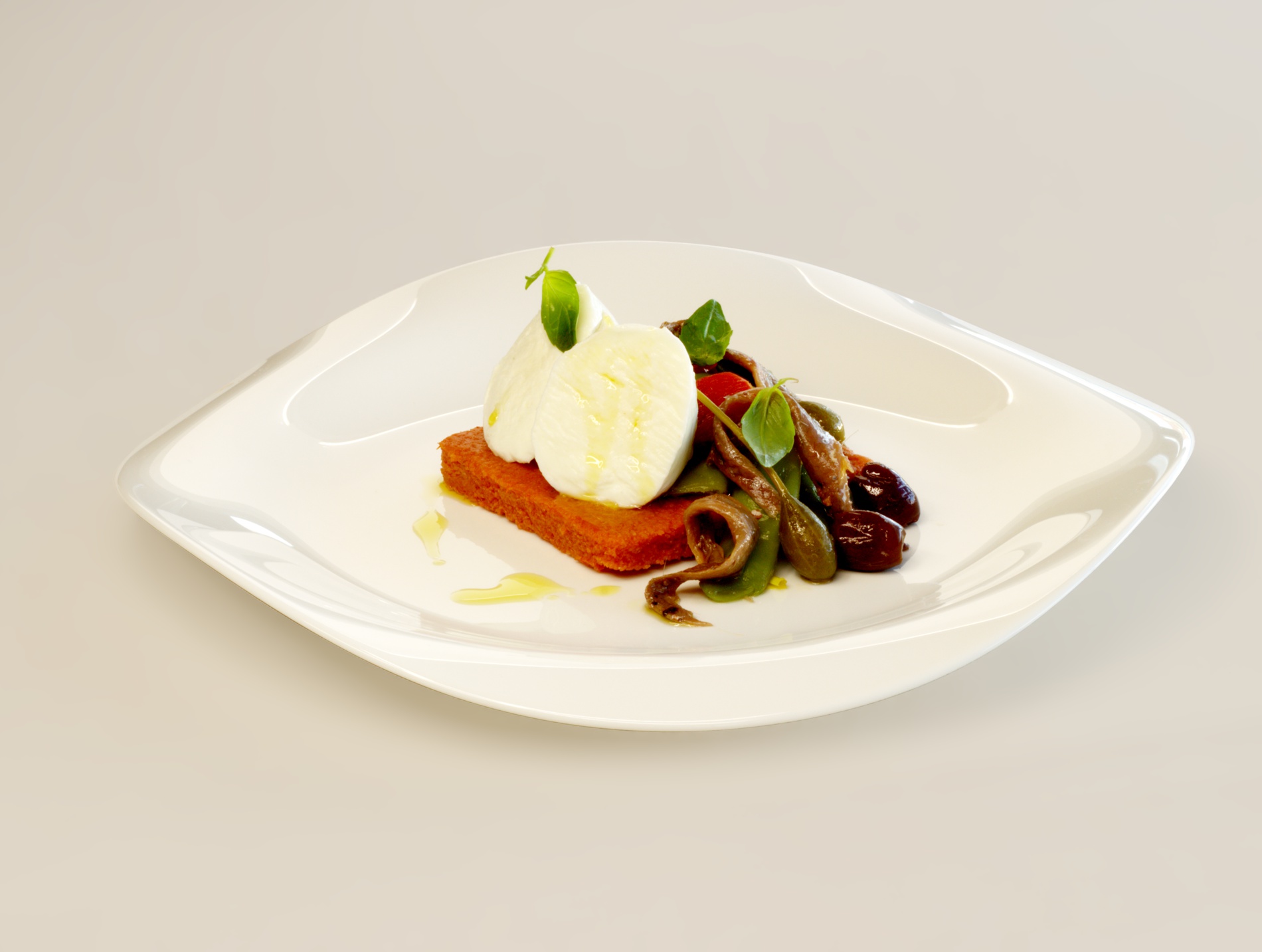Carpaccio di pappa al pomodoro con verdure acciuga e mozzarella di bufala