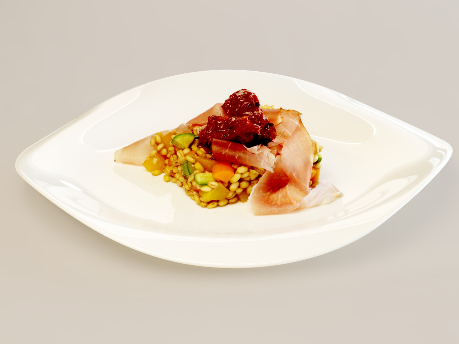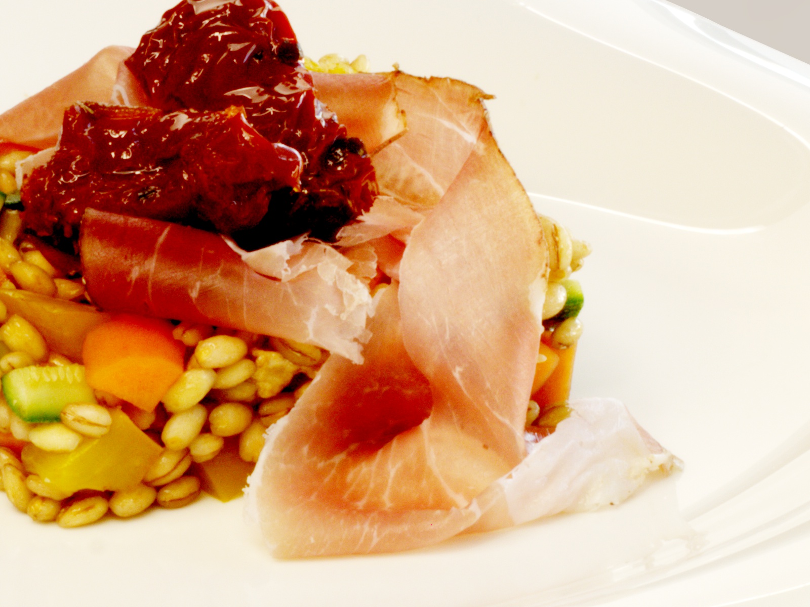 Farro perlato verdure pomodori secchi e speck